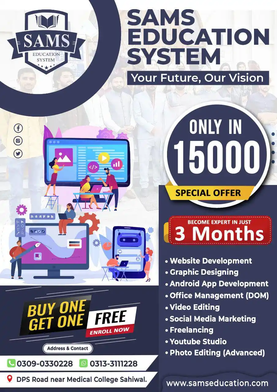 #SamsEducationSystem #ShortcomputerCoursesInSahiwal #ShortCoursesInSahiwal #ComputerCourses #FreeCourseOffer #UpgradeYourSkills #DigitalWorld #TechnologyEducation