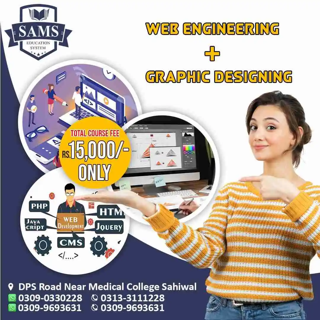 The best Web Engineering Plus Graphic Designing Course in 5 Months Course Just in 3000RS - Per Month. Special Offer. No extra charges No hidden charges. Practically Work. Don't ‘ Worry if you have no laptop. SAMS Education System is here for your help.